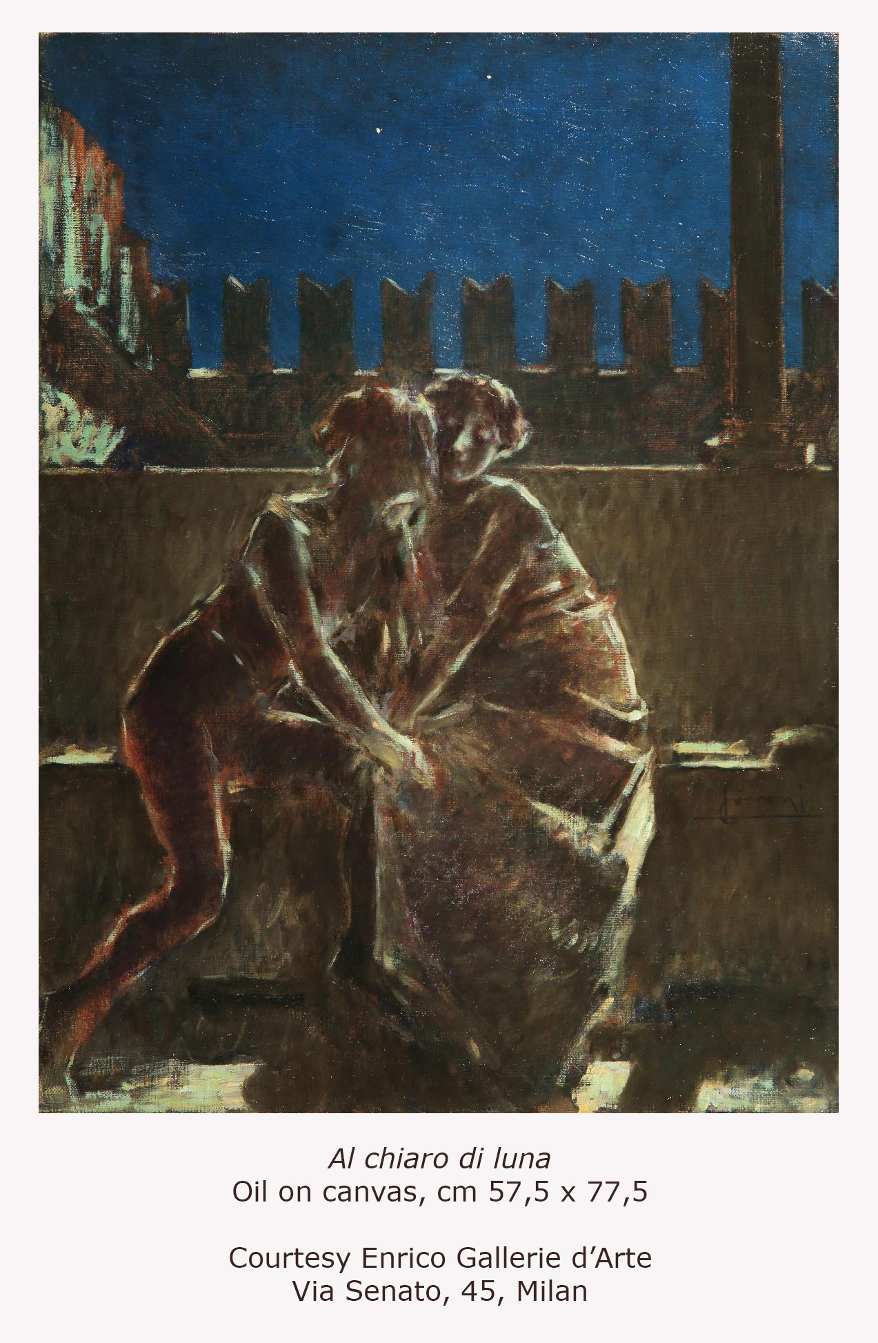 It is very likely that the subject, referable to the 1880s, can be identified with the nocturne entitled Amanti which Raffaello Giolli writes about in his monograph on the artist, linking it to a written note by the painter. See Raffaello Giolli, Luigi Conconi, Prospetto Biografico-Critico, Rome 1920, p. 55