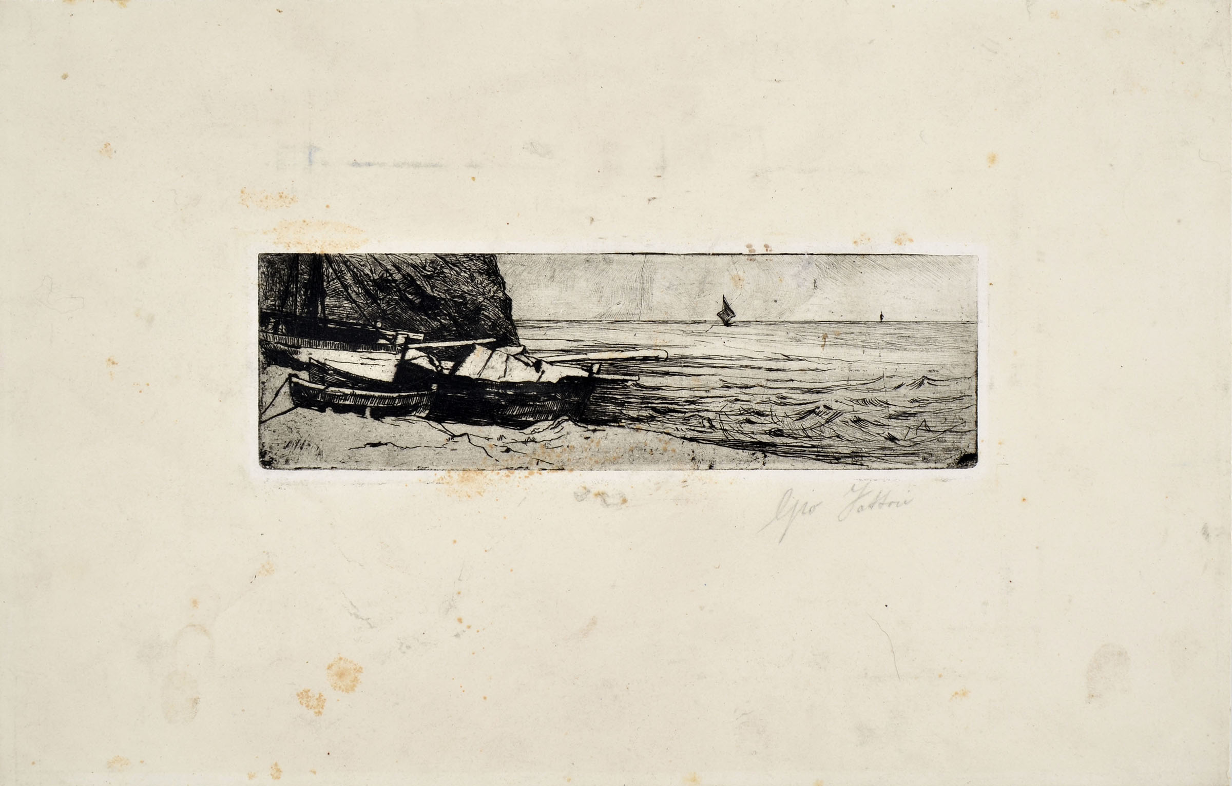 Copper etching, ante 1888, Baboni-Malesci XLIX. A fine impression printed in black ink on cardboard. Signed Gio Fattori in pencil in the bottom margin. Our print shows, with great clarity, the lightly etched lines that form the background sky, which tend to disappear in later printings. Authenticated in pen on the verso by Carlo Grimaldi (1882-?) who was director of the Scuola di Incisione presso il Poligrafico dello Stato.