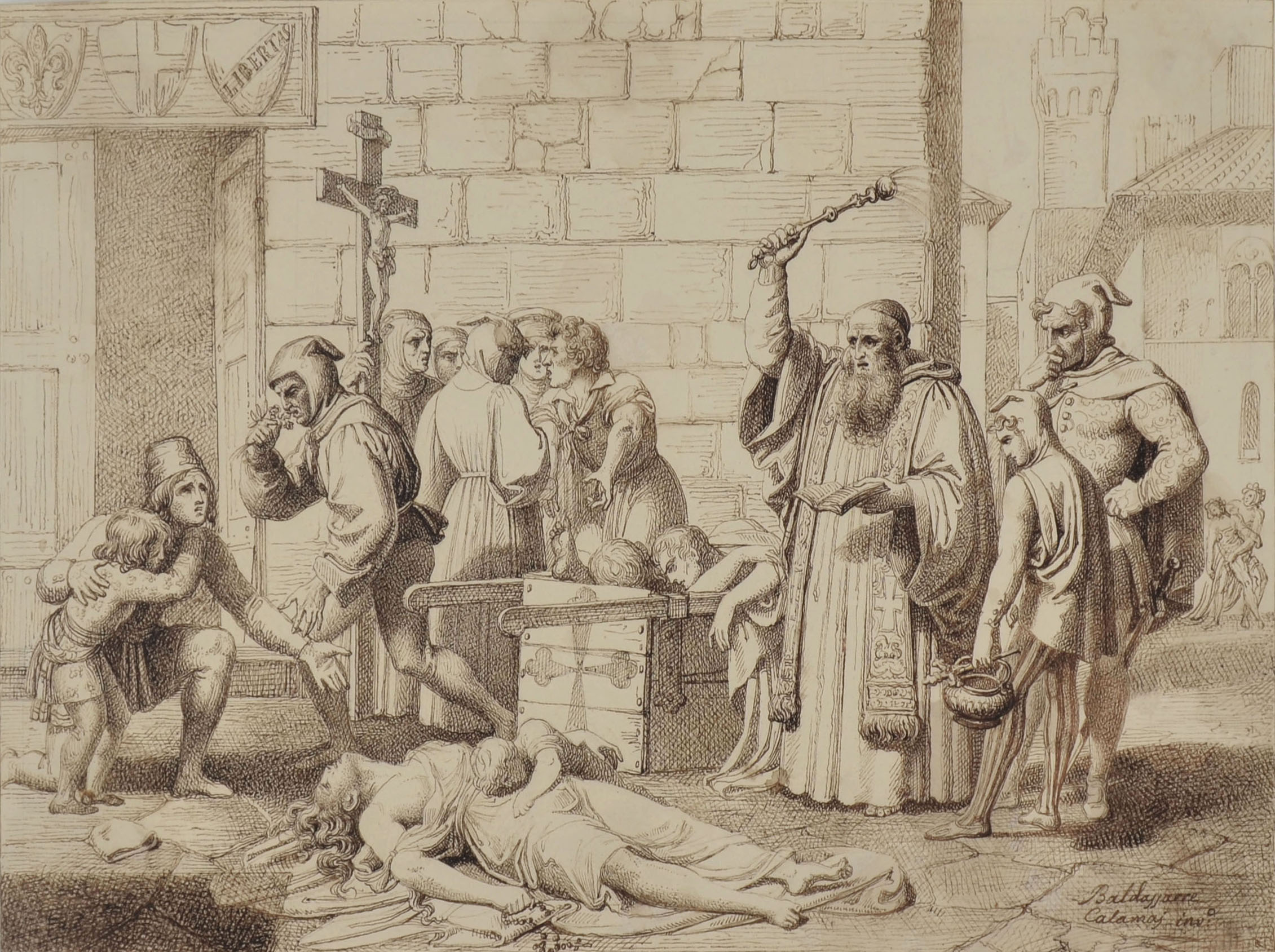 Pen and brown ink. Signed Baldassarre / Calamaj inv°; 202 x 270 mm. The drawing is connected with one of the most celebrated paintings by the artist, the first version of whom was exhibited in 1828. A second version of the painting (1836) is in the Florentine Galleria dell'Accademia (inv. Accademia, n. 395).