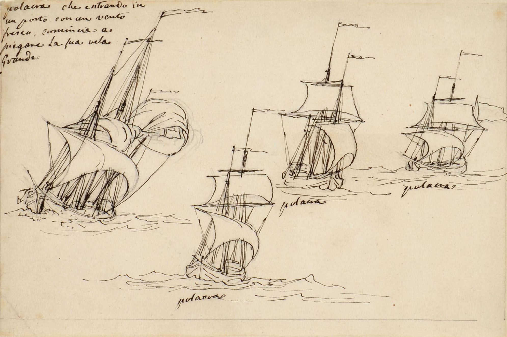 Inscribed in pen Polacra che entrando in un porto con un vento fresco, comincia a piegare la sua vela grande. 139 x 210 mm.