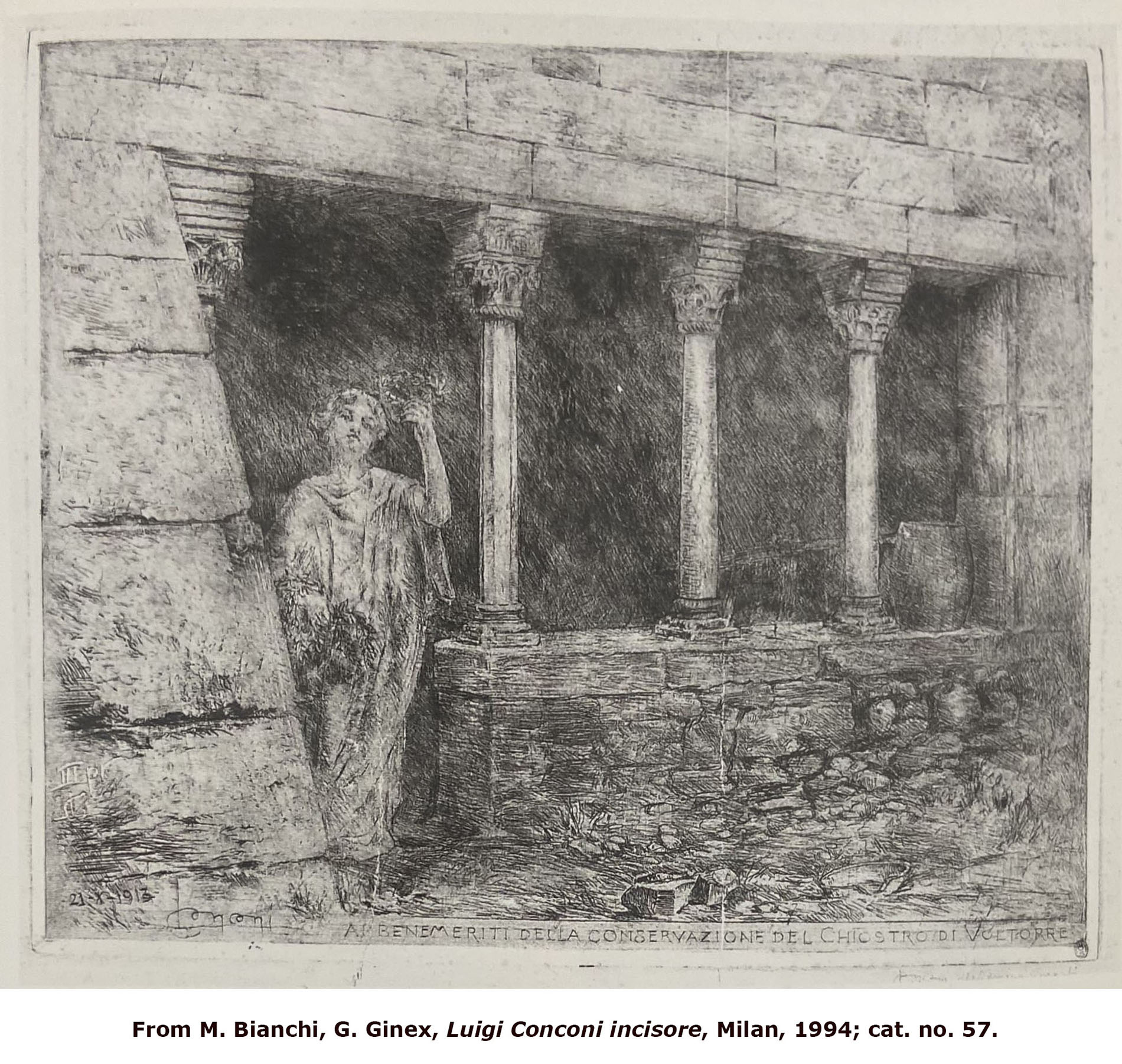 It also appears in an etching in which Conconi mocks the behavior of the State, which after having refused his proposal to purchase and restore it, had allowed his part of the cloister to burn. See M. Bianchi, G. Ginex, Luigi Conconi incisore, Milan, 1994; cat. no. 57.