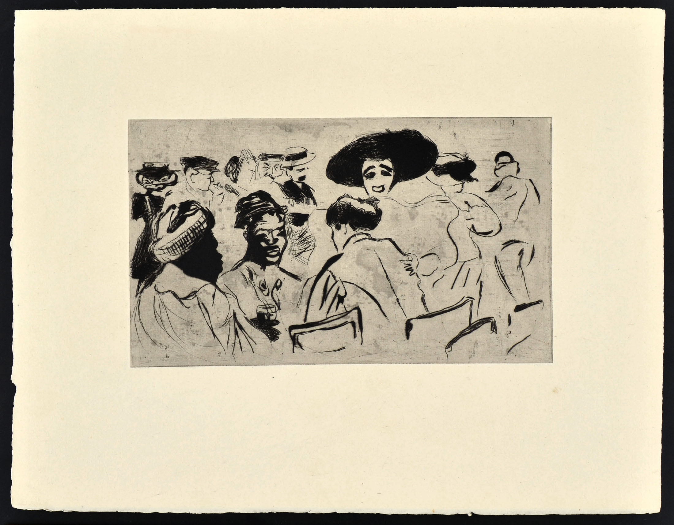 Drypoint, from the series Paris qui Bouge; fine impression on laid paper, with full margins.