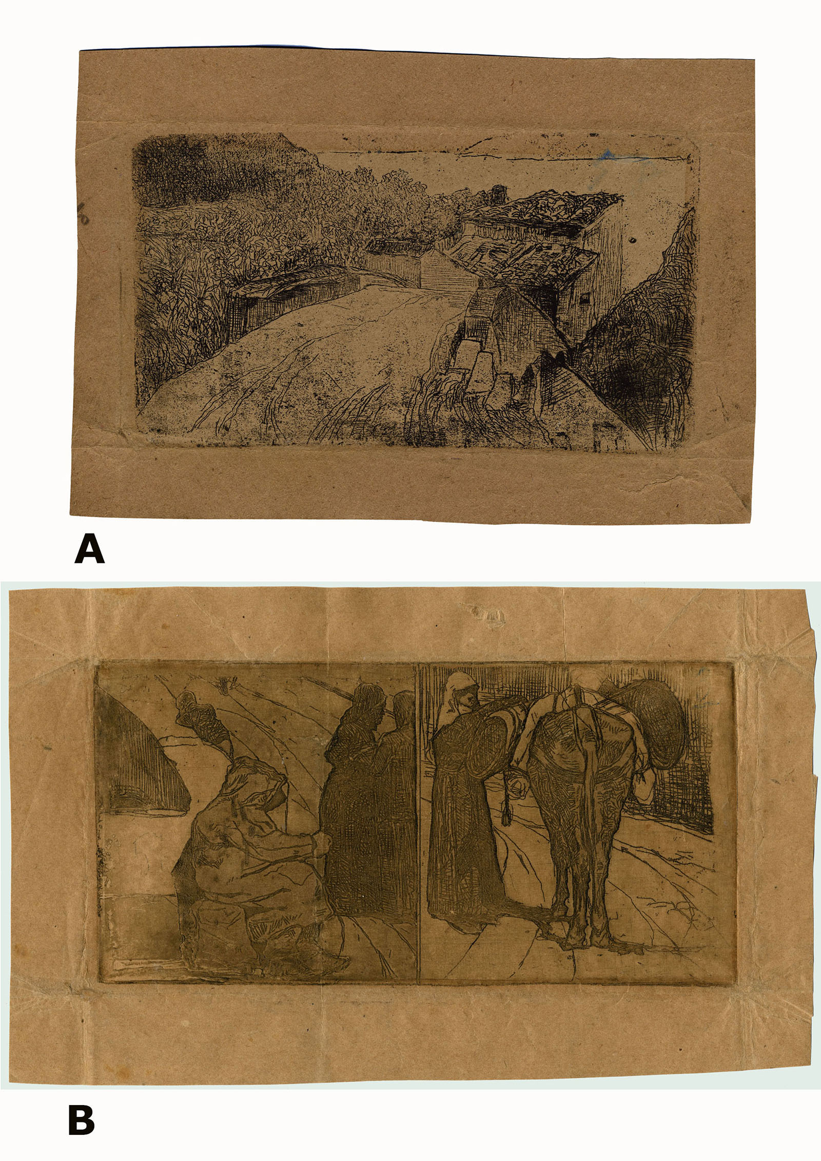 Both the prints have the characteristics of the impressions pulled by Fattori himself, or under his direct guidance, with his small hand press. These impressions were printed on various types of paper, often recovered by chance, easily recognizable by the narrow margins and sometimes used to wrap the plates and recognize them (as it is the case for the present impressions). Several examples are in the Franconi collection. See: Andrea Baboni, Le incisioni di Giovanni Fattori nella collezione Franconi, Florence, 1987; nos. 4, 26, 28, 64, 74, 78 and 85.