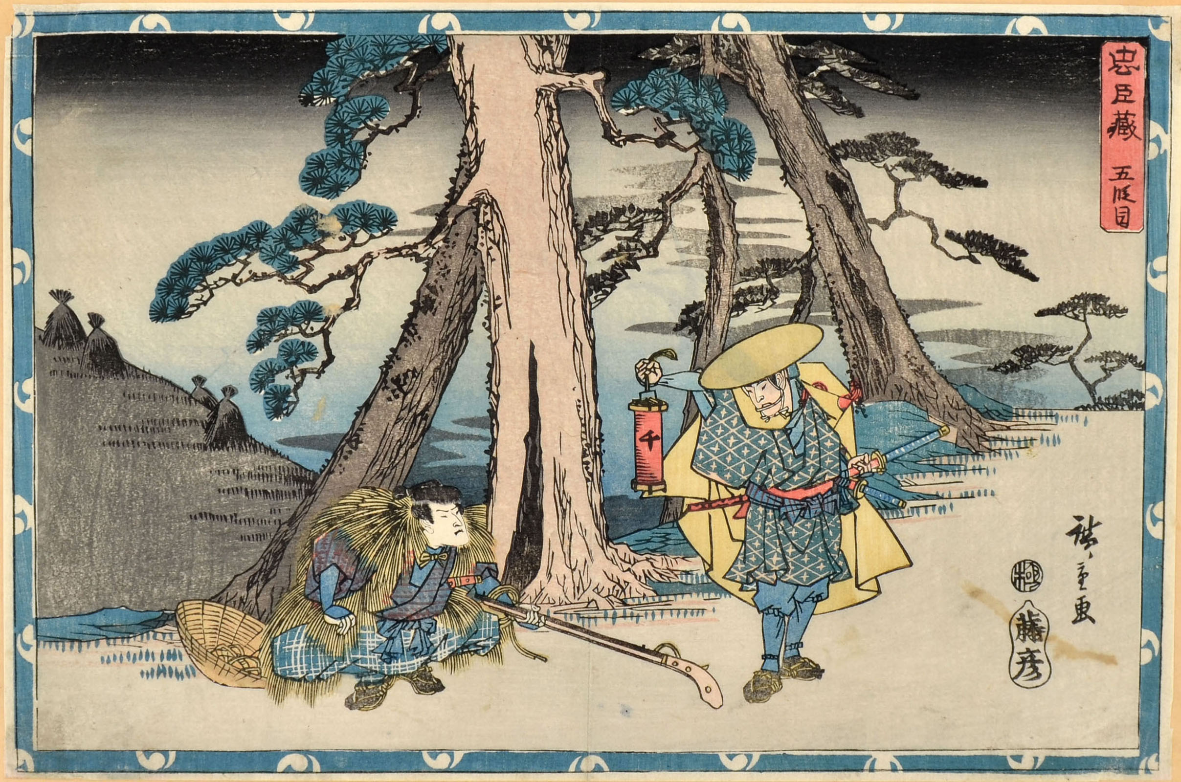 Fine and even impressions. All prints retain the original border: Yuranosuke's double tomo-ye crest. On the contrary, in the only other complete series known to me (Boston, MFA) this decorative border has been cut off.