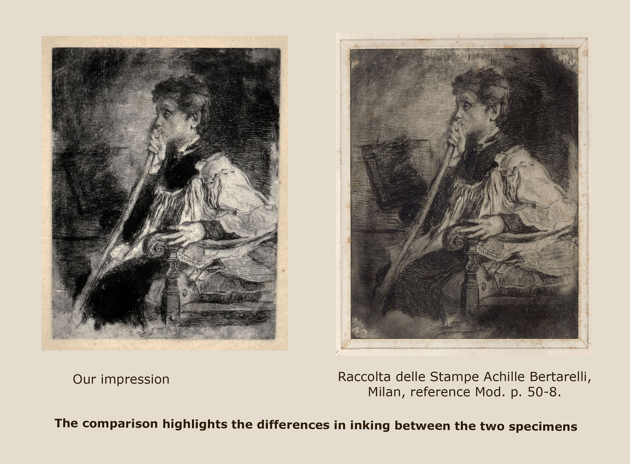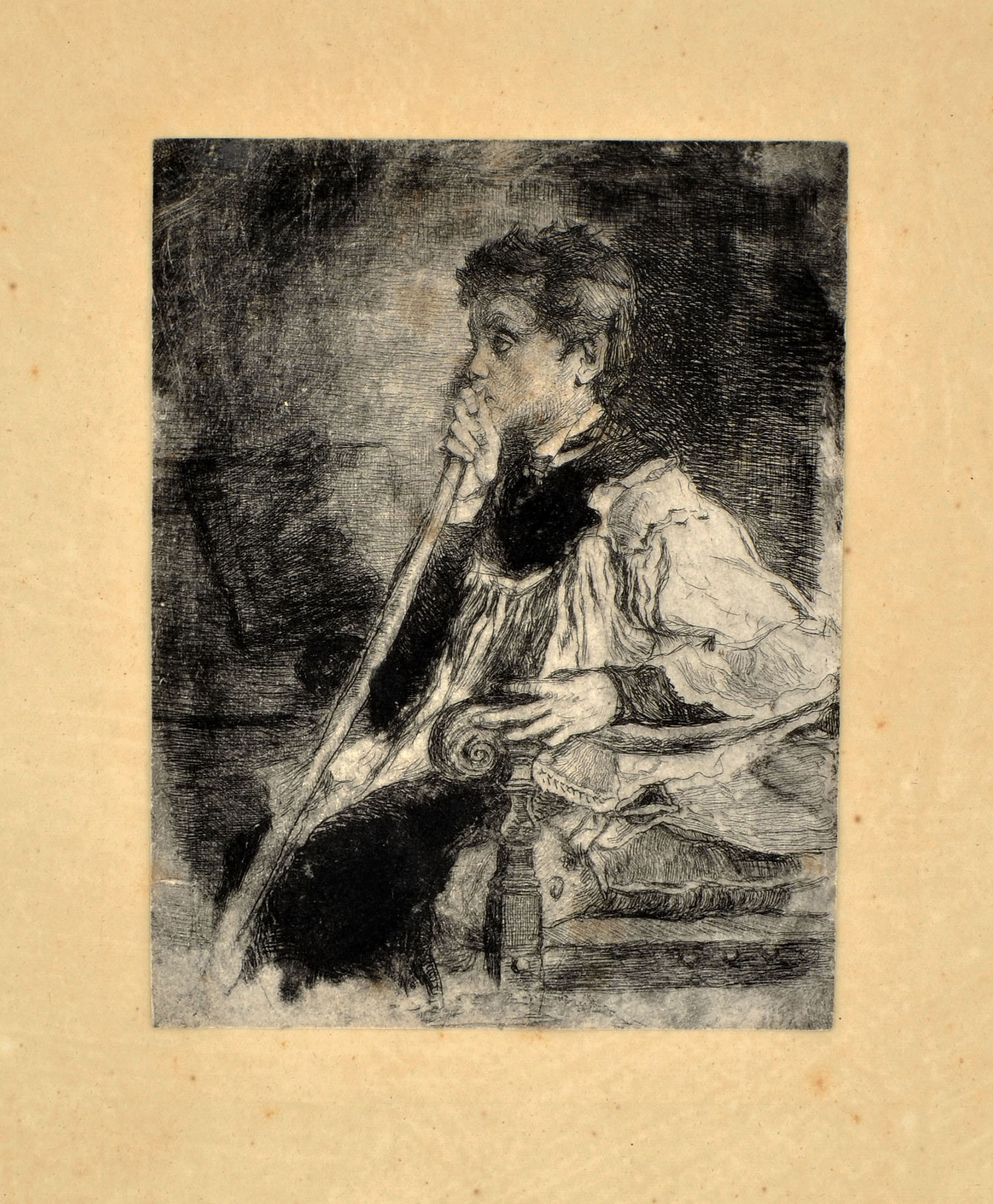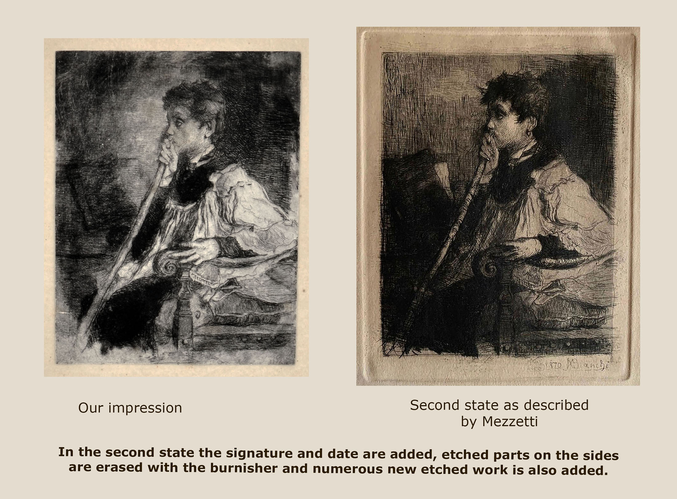 Etching and drypoint (acquaforte monotipata), Mezzetti 74. First state of two, unknown to Mezzetti, before the signature and date and before later interventions with a burnisher and additional etching. A truly fine impression, with distinctive inking, mounted on a presentation card. The sheet 143 × 109 mm.