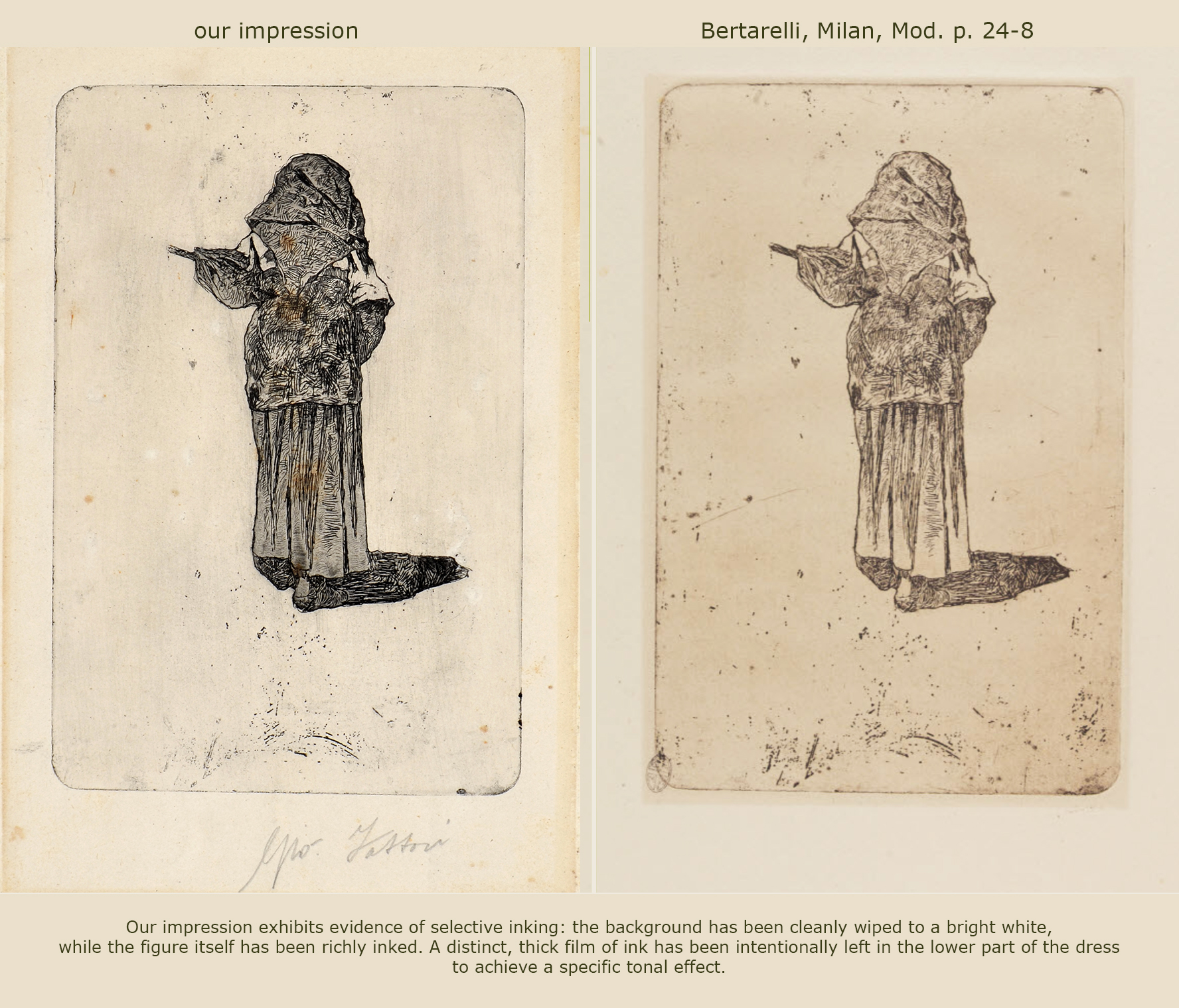 A fine impression printed in black ink on cardboard, with selective inking. Signed Gio Fattori in pencil in the bottom margin. To the platemark 205 x 136 mm, the full sheet measuring 344 x 243 mm. The paper is unevenly toned, due to exposure to light in the frame.