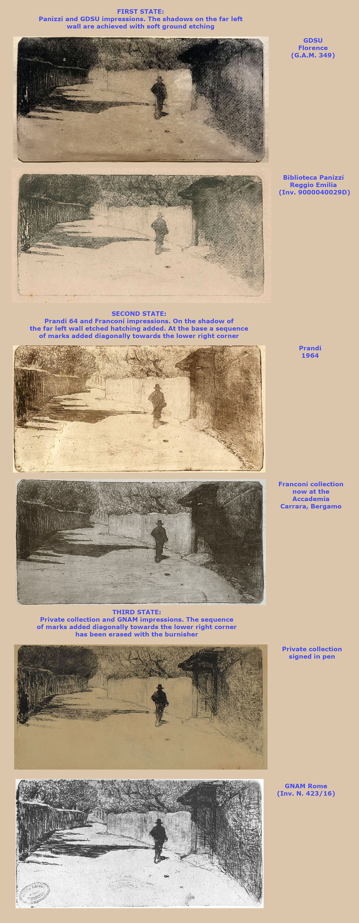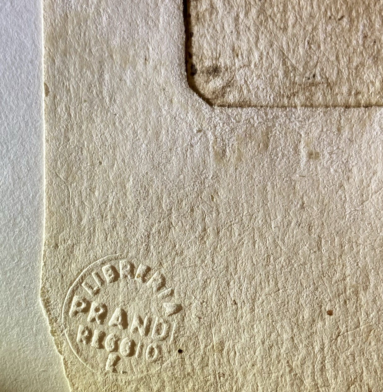 The impression I am fortunate enough to present now had already been described by Andrea Baboni in his 1983 catalogue as present in a 1964 Prandi catalogue, but its current whereabouts were unknown. Of the six known examples, this is the only one printed in sepia ink. The impression is clear and sharp, pulled on thick paper; the Prandi mark bottom left corner. The dimensions at the plate-mark are 81 x 160 mm. The full sheet measures 125 x 188 mm.