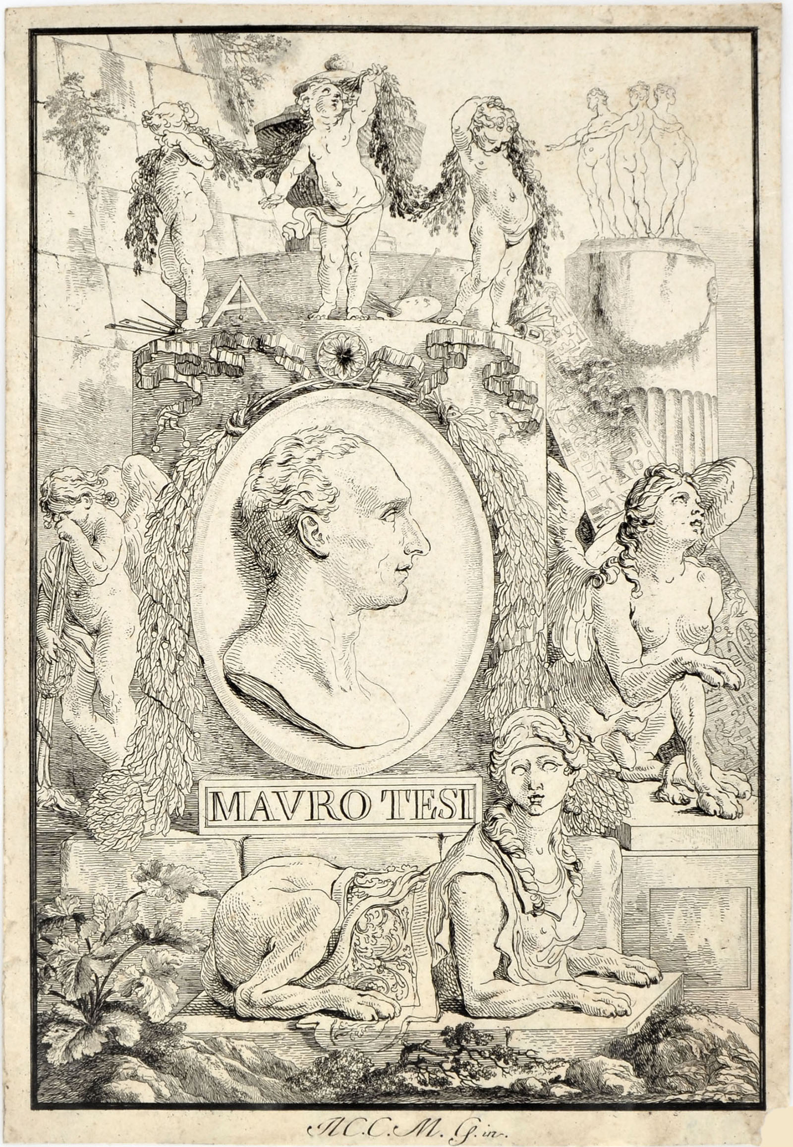 As Gozzi indicates, this plate opens the series of 42 etchings that make up the magnificent volume Raccolta di disegni originali di Mauro Tesi estratti da diverse collezioni pubblicata da Ludovico Inig calcografo in Bologna. Published by Count Cesare Massimiliano Gini, owner of some of Tesi's drawings reproduced in the volume.