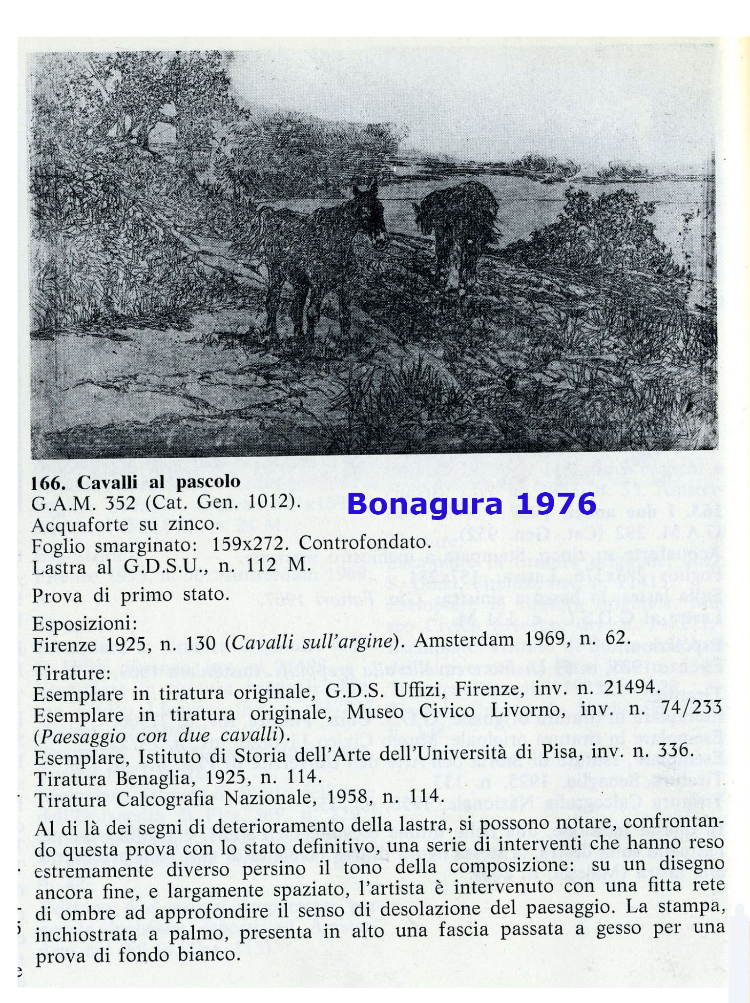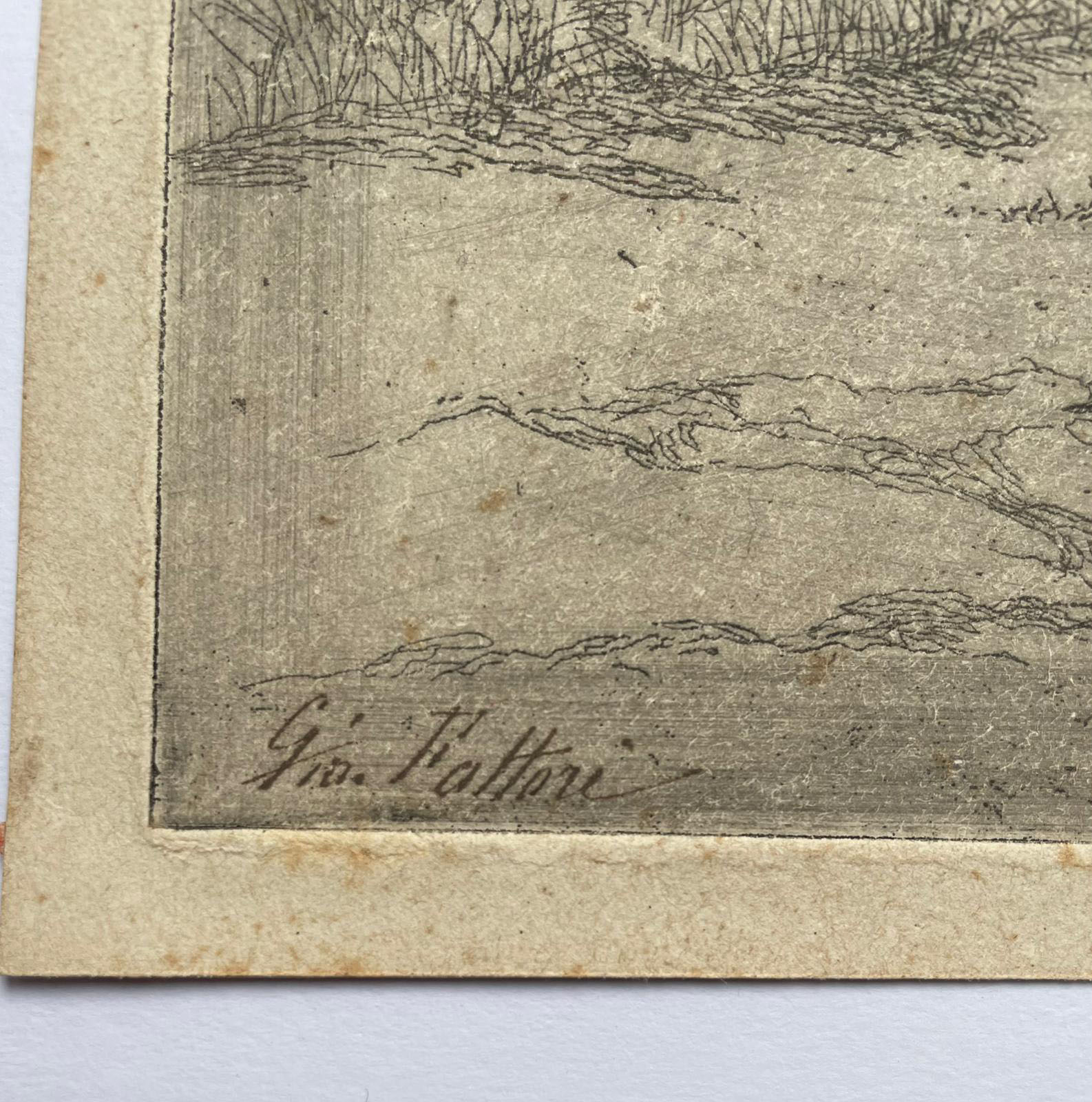 Like the Florence specimen, ours also shows selective inking: the lower part of the composition is printed with a veil of ink, while the sky background remains completely white due to partial cleaning of the plate. Our impression is printed in grey ink, giving the print a silver tone, and is signed in pen and brown ink Gio. Fattori at the lower left. Note Fattori's pen signature, similar to the signatures on his paintings, which seems to confirm his belief that this etching also has the dignity of a work in its own right.