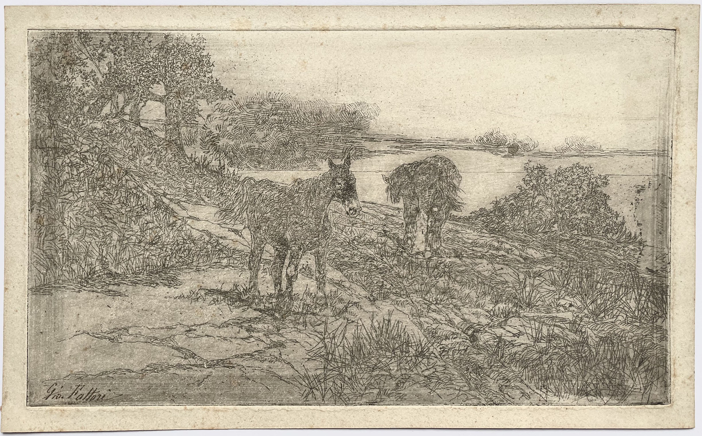 Giovanni Fattori, possibly the most important painter of the nineteenth century in Italy, received his first instruction in drawing from a lesser painter of his native town. In 1846 Fattori moved to Florence to attend the Academy. During the 1850s Fattori joined the innovative artists, called Macchiaioli, who met at the Caffè Michelangelo in Florence and were champions of a new technique and style to contrast the conventional academic language. During those years, he still produced works that could be attributed to the historical-romantic school but his interest in studying from life also extended to landscape painting and the military life of the day became the subject of his first experiments in painting using the macchia technique. In 1867, after the death of his first wife, Fattori frequently stayed in the Maremma region which became the ideal backdrop for his works. Fattori began etching in the early 1880s, when he was nearly sixty; quite soon he was able to appreciate the difference of expression he could achieve using this new medium. A real peintre-graveur, he continued with etching his artistic research on light and essential shapes in reality.